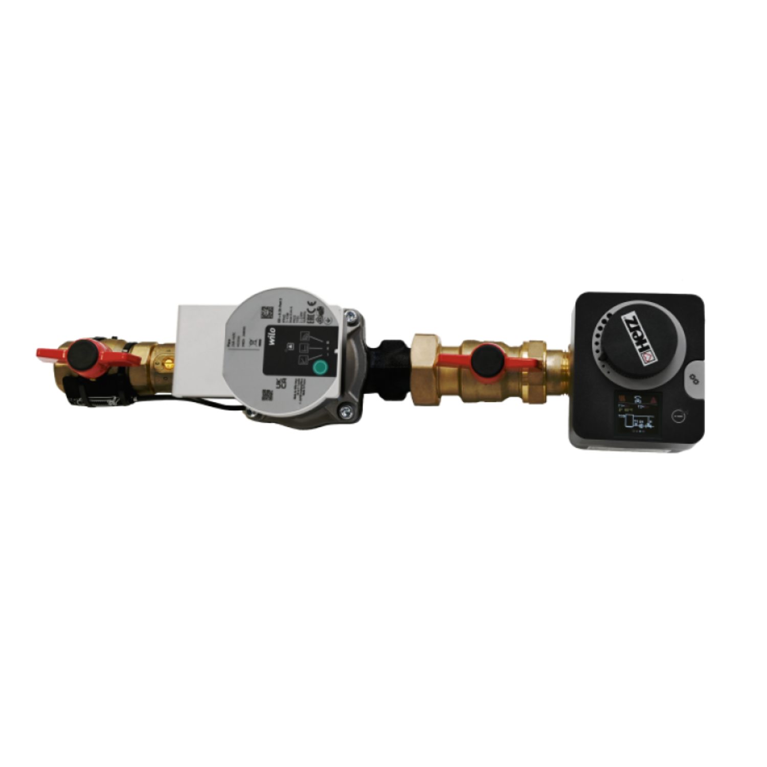 Set per incremento della temperatura di ritorno per sistemi a biomassa, con valvola miscelatrice a 3 vie a sfera, servomotore, circolatore e valvola di non ritorno.