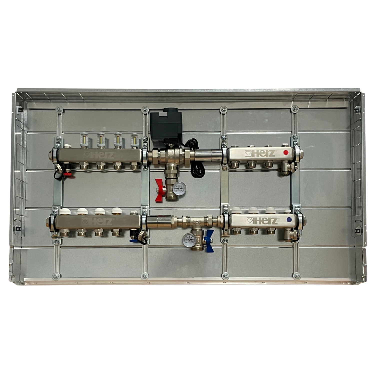 Modulo idronico premontato per la distribuzione di impianti misti a doppia temperatura. Il sistema KLIMEASY DUAL è una cassetta metallica preassemblata contenente: